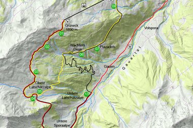 Grüneck (1890 m) - Obere Latschätzalpe - Obere Sporaalple - Lindauer Hütte - Untere Sporaalpe - Untere Latschätzalpe - Wachters Dieja - Plazadels - Matschwitz