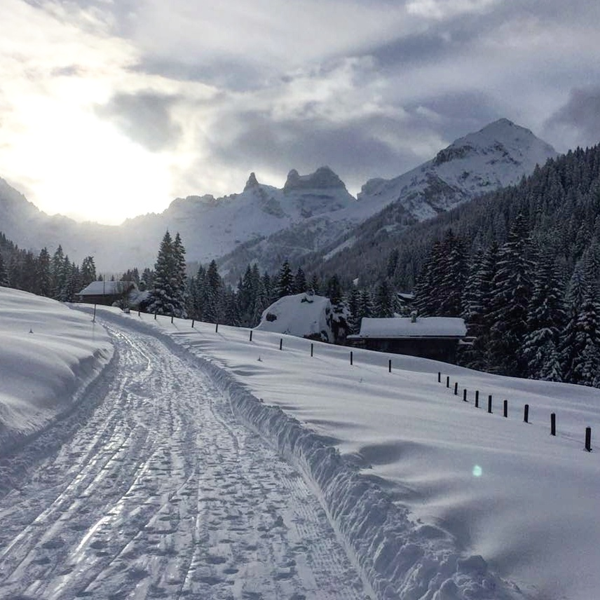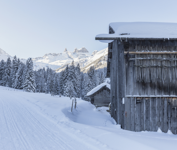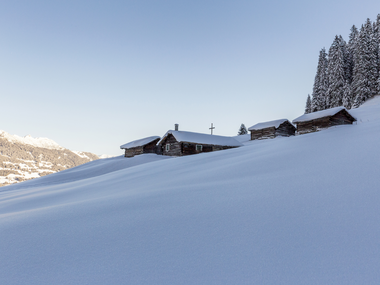 Die Wanderpiste führt im Verlauf eines Forstwegs mit einigen Windungen durch Bergwald und verflacht sich im waldfreien Hochtälchen der Sanüel-Alpe. Bald kommt man dort zu einem Wegweiser, der den kürzesten Weg nach Latschau anzeigt. Für eine Genusswanderung gönnen wir uns aber einen kleinen Umweg, indem wir auf einem fast ebenen Weg noch zehn Minuten bis zur Volsporalpe weitergehen. Dabei betreten wir den schönsten Teil des Gauertals und werden mit dem eindrucksvollen Anblick der Drei Türme belohnt. Und wieder kann man es als einen Hauch von Nostalgie empfinden, wenn man die alten Alp- und Maisäßhütten von Volspora in verschneiter Winterruhe vor sich sieht.