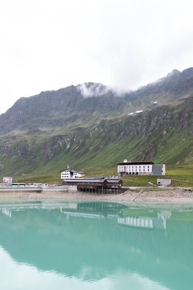 Die ersten Schritte auf dem Silvrettasee Rundweg wecken bereits sämtliche Sinne und führen uns beim Restaurant Silvrettasee vorbei. Wer motorisiert anreist, kann sein Auto auf der Bielerhöhe übrigens auf den vielen Parkplätzen entspannt abstellen. Hier, hoch oben auf 2.032 Metern Seehöhe direkt am Ufer des Stausees, kann ich mir gut vorstellen, dass Schnitzel, Burger und Torten besonders munden.