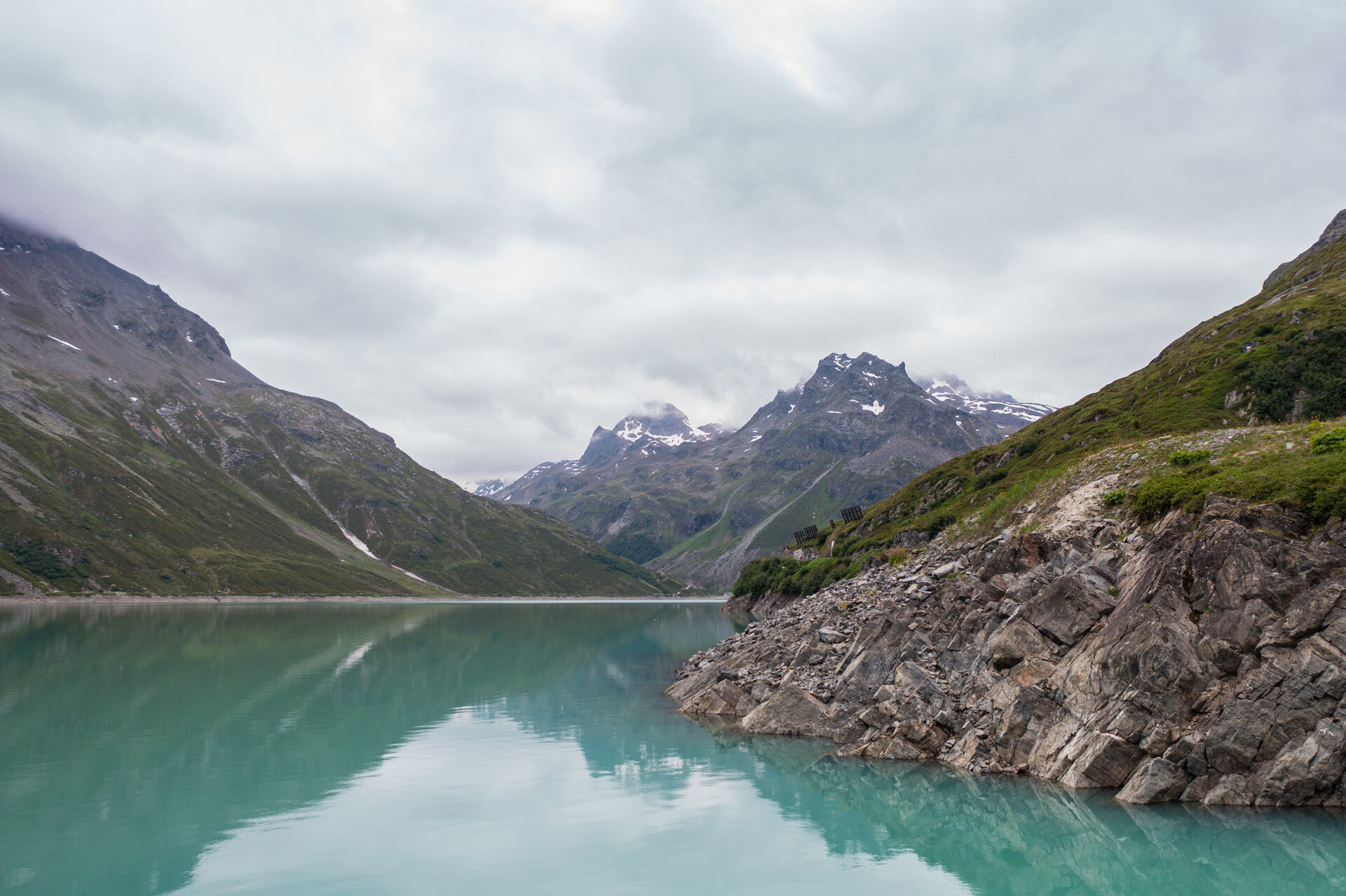 Ein wenig weiter dem Uhrzeiger und Ufer entlang öffnet sich die Landschaft dann so richtig, und das sogar zu beiden Seiten. Die majestätischen Montafoner Berge, die Weitsicht auf die Gletscherlandschaft und der funkelnde See stets an unserer Seite verschmelzen zu einem Postkartenanblick, der Herz und Augen zum Leuchten bringt.