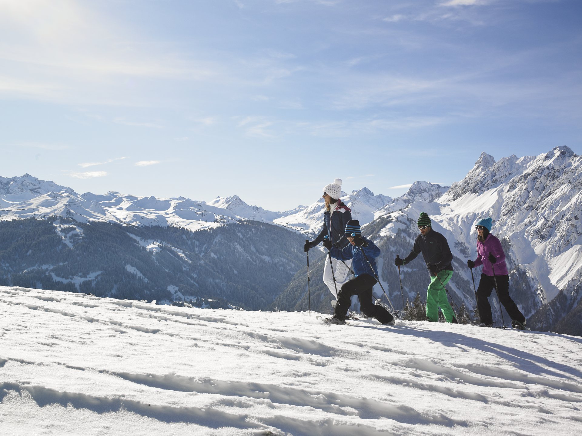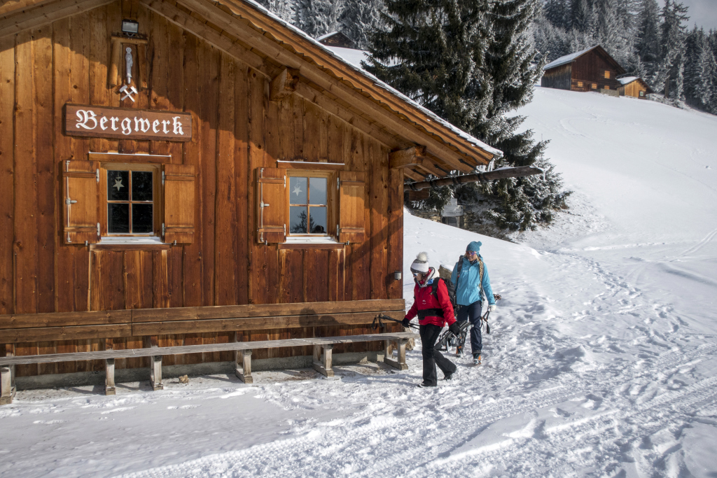 The snowshoe hike starts at the parking lot opposite the Baroque church Bartholomäberg. Follow the marking cross-country up to the Hennakopf settlement. You will cross the Roferweg and again follow the route cross-country up to the historic mine. Until then, you will cross the Roferweg about 3 more times.