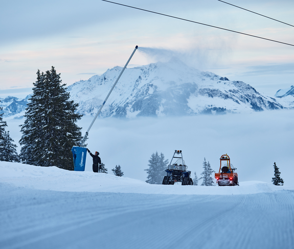 Im Montafon genießen wir grundsätzlich eine hervorragende Schneesicherheit dank unserer Höhenlage. Technische Beschneiung kommt deshalb nicht aus der Notwendigkeit, fehlenden Naturschnee auszugleichen, sondern gezielt zum Einsatz, um die Wintersaison abzusichern.
