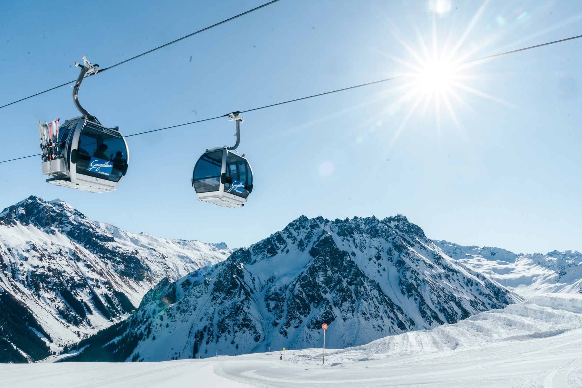 Zwei Gondeln der Schafbergbahn in Gargellen schweben vor einer beeindruckenden, schneebedeckten Bergkulisse. Die modernen Kabinen der Gargellner Bergbahnen heben sich klar vom hellen Winterhimmel ab, während im Hintergrund die majestätischen Gipfel der Montafoner Alpen aufragen. | © Gargellner Bergbahnen GmbH & Co KG, Daniel Zangerl