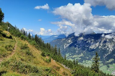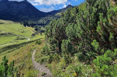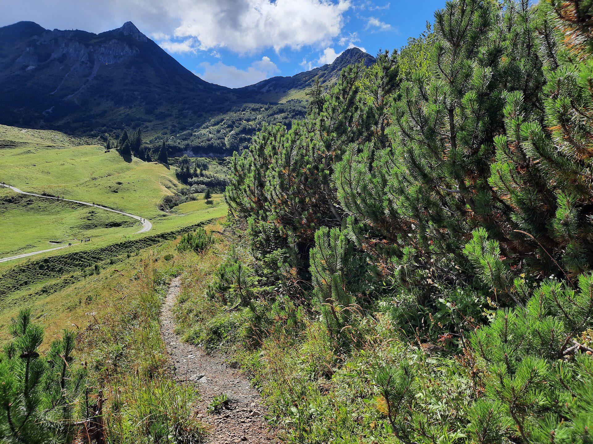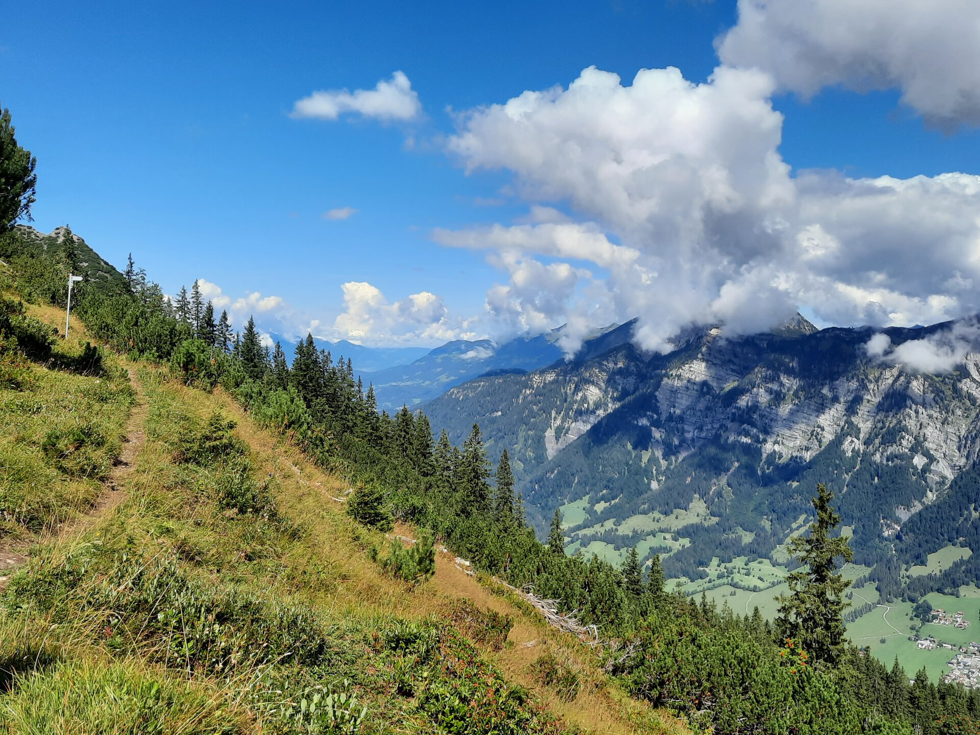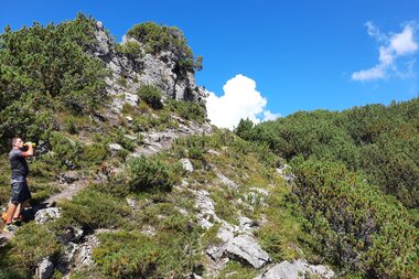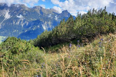 Wir steigen ein kurzes Stück am Wiesenhang hinab, mit Ausblick auf die Itonskopfgruppe und auf die Alpe Latons, um kurz darauf auf schmalem Pfad links abzubiegen. Es ist ein toller Weg; abwechslungsreich, inmitten vom satten Grün, Alpenblumen und Latschenkiefern – und ab und zu zeigen sich Gipfelkreuze vor uns: der Zwölferkopf und links versteckt unser Gipfel: die Davenna. Im leichten Auf und Ab ist der landschaftlich reizvolle Weg nie anstrengend, insgesamt sind bis zum Gipfel nur knapp 250 Höhenmeter zu bewältigen. Bald ein kurzer Anstieg über Gestein, das eine kleine Geschichte beherbergt. Wie ich von Michael erfahre, liegt hier eine der seltenen Stellen vor uns, wo Kalk mit Muschelschalen auf dem Flysch als Fossilreste zu finden sind. Zeitzeugen aus dem Meer, die vor 25 Mio. Jahren durch den Zusammenprall der Kontinente Afrika und Europa nach oben geschoben wurden.