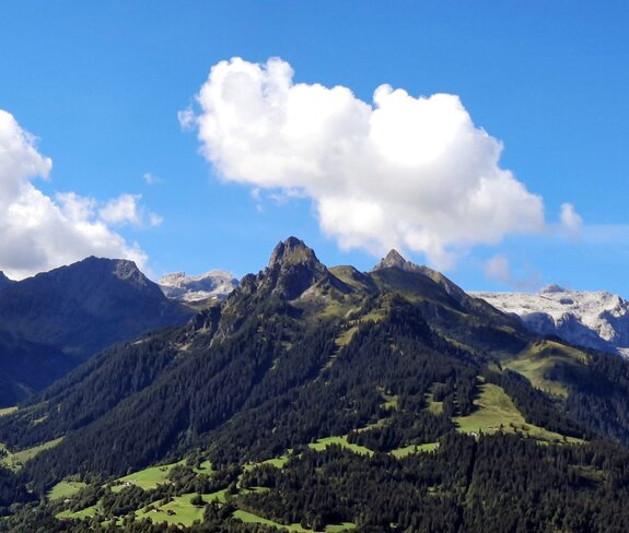 Michael nennt mir dennoch ein paar Gipfel: Gegenüber die Rote Wand im Lechquellenbegirge, da die Silvretta mit dem Silvrettahorn und Großlitzner, dort die Gargellner Köpfe, rechts der Rätikon mit der Sulzfluh und den Drei Türmen, und dort Zimba und Schesaplana…