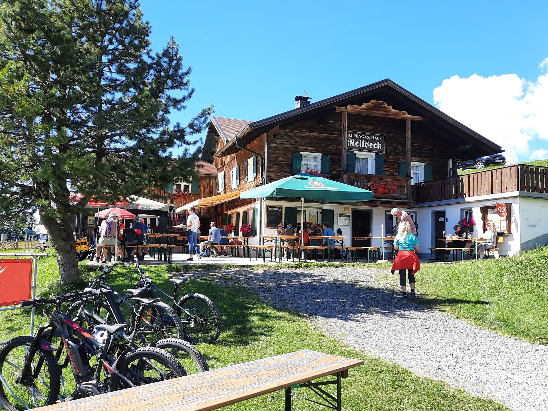 Das bringt mich dann auch gleich auf einen Gedanken: Eine Einkehr wäre jetzt genial! Das Alpengasthaus Rellseck wartet ja. Aber heute scheint unten auf der Alpe Latons ein Wanderfest zu sein. Wir hören Alphörner und sehen einige Wanderer und Einheimische bei regionalen Köstlichkeiten gemütlich zusammensitzen. Klar, dass wir dort mal schnell vorbeischauen wollen, mit E-Bikes ist man ja auch fix wieder oben. Michael erklärt dabei, dass er mit seinen Gästen weitegehend flexibel reagieren kann. Wenn man hier an der Alpe Latons kurz vorbeischauen will, ist das auch okay. Oder wenn hier einige warten wollen, während die anderen mit dem Guide zur Davenna laufen.