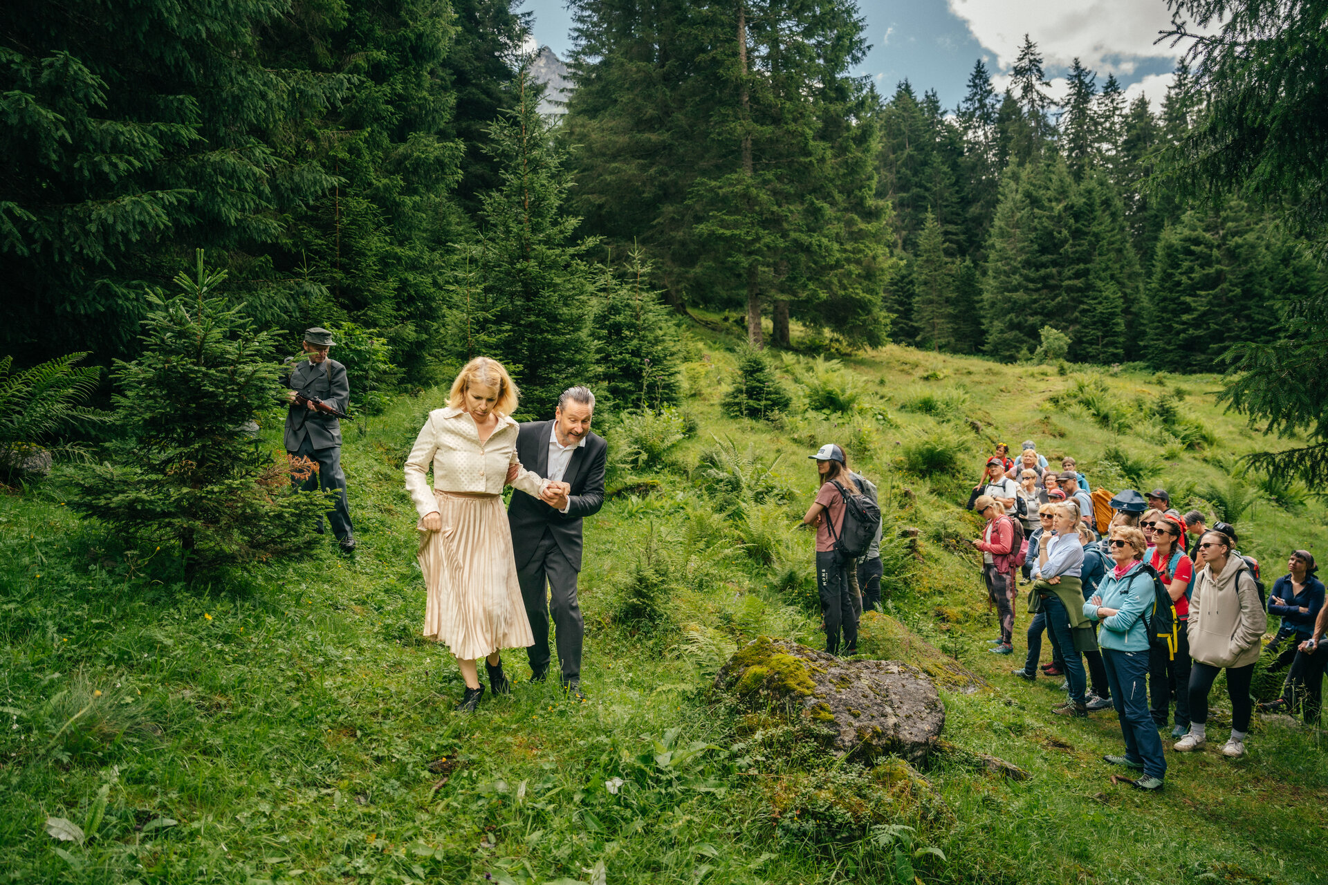 Apropos: Das legendäre Grandhotel Madrisa, 1905 errichtet, beherbergte zahlreiche Größen der Vergangenheit. So kommt es, dass einige Spielszenen gleich hier auf der Hotelterrasse stattfinden, auch das nahe Hotel Heimspitze und besondere Aussichtspunkte sind spielerisch ins Stück eingebunden. Gerade diese genauen Recherchen rund um die zitierten Begebenheiten und Personen der Geschichte zählen zu den großen Qualitäten des Stücks, so dass der Ort Gargellen nie „nur“ Kulisse, sondern immer Teil der Geschichte ist. Und neben gebührend ernsthaft gespielten Szenen sind es die übermütigen Sequenzen, die stark in Erinnerung bleiben. Zum Beispiel jene letzte am Gitzistee, ein übergroßer Findling auf einer Alpwiese, dem die Schauspieler auf's Dach steigen, um eine hinreißend „zickig“ getanzte Performance als Latein sprechende Gämsen hinzulegen.