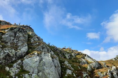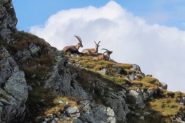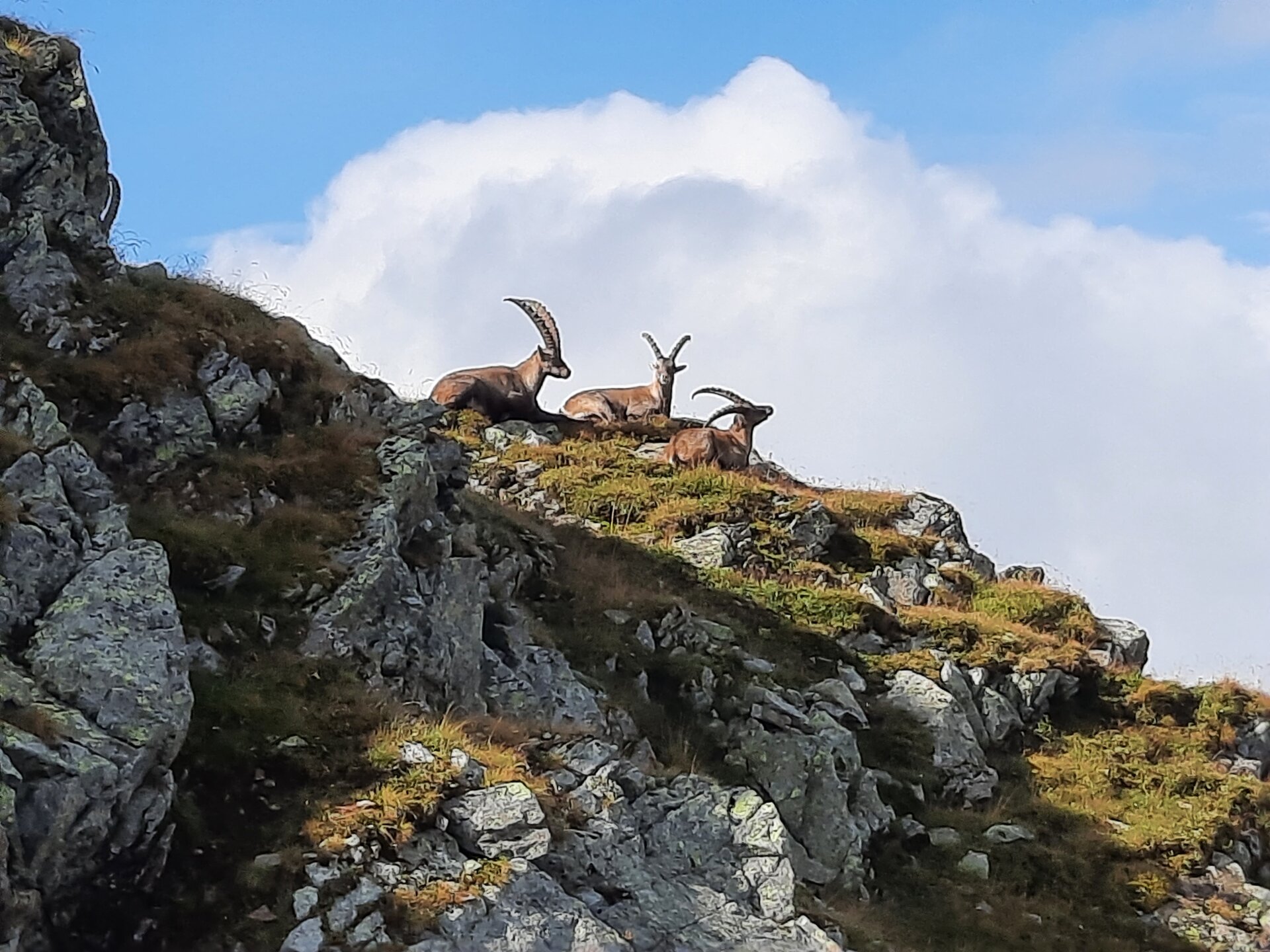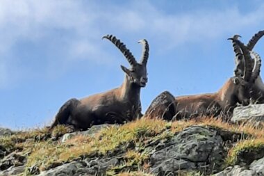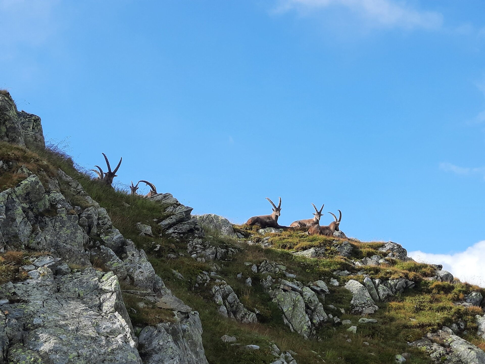 Der Blick nach links reißt mich aus meinen Träumen, und doch traue ich meinen Augen nicht: Eine ganze Herde an Steinböcken schaut zu uns hinab. Vorsichtig gehen wir auf unserem Weg weiter und kommen ihnen so noch näher. Von meinem Wanderführer erfahre ich, dass die Herde sich hier in einem relativ kleinen Umkreis bewegt. So verbrauchen die Wiederkäuer nicht allzu viel Energie und können gut überwintern. Futter finden sie dennoch auf Lawinenhängen, an denen das Gras zum Vorschein kommt.