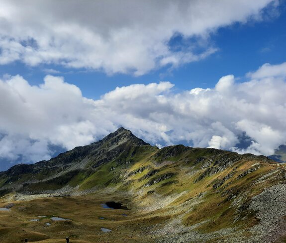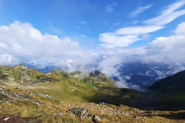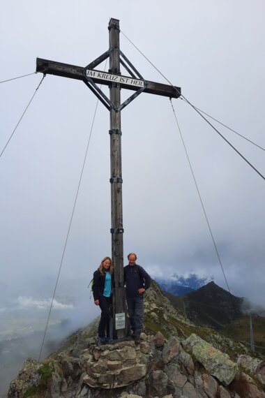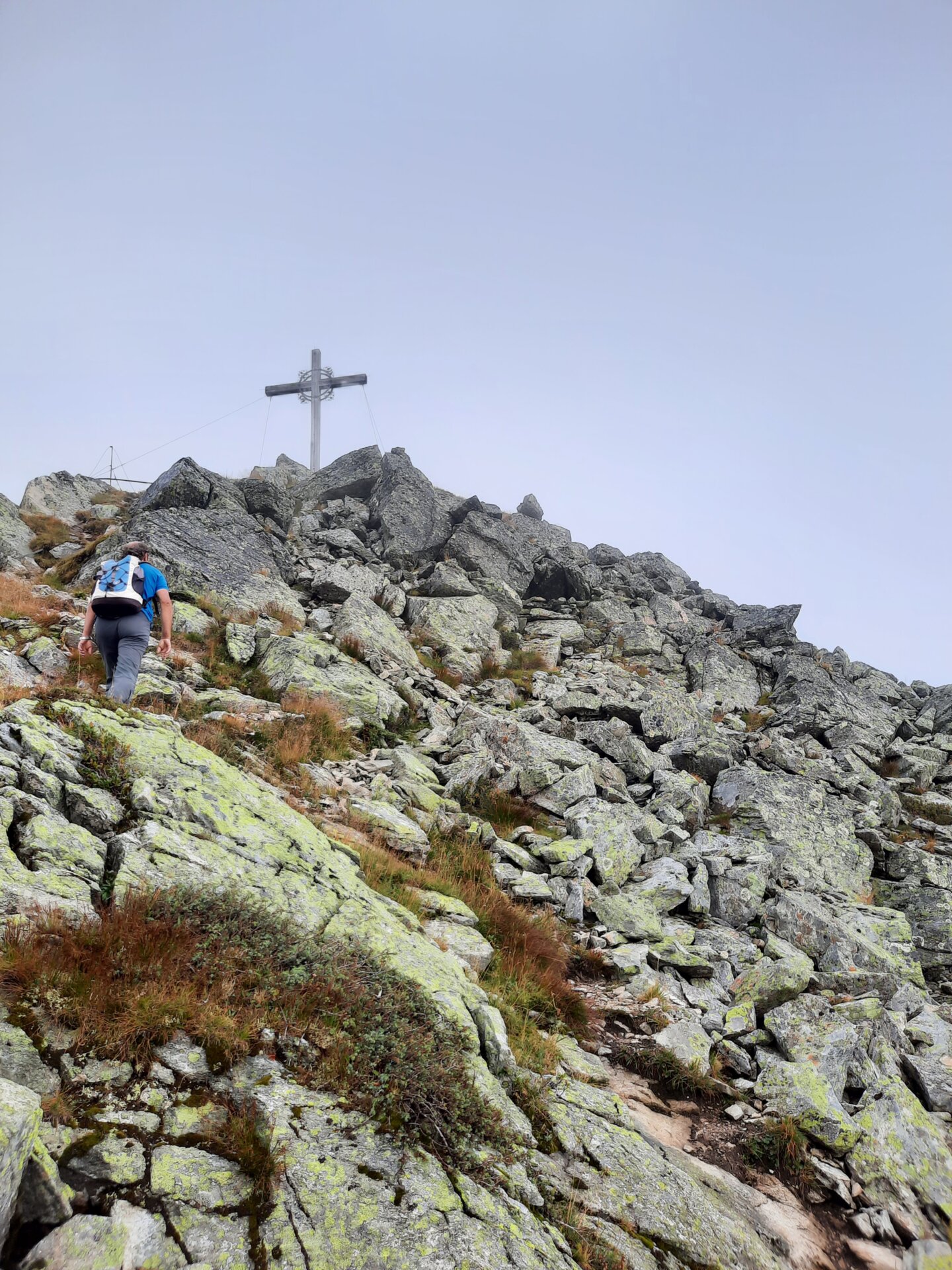 Viel zu schnell stehen wir am Gipfel der 2.386 Meter hohen Zamangspitze. Obligatorisches Gipfelfoto – und noch obligatorischer: die Jause, die nirgends so gut schmeckt wie oben am Gipfel! Immer wieder eröffnen sich atemberaubende Ausblicke, die kurz imposante Berge freilegen, nur um sich kurz darauf wieder in Wolken zu verhüllen. Ich klaue jetzt mal Alfreds wording: Reiner Alpen-Striptease. Das aber mit sparsamen freigelegten Ein- bzw. Ausblicken. Wie wir so auf die 226 Gipfel kommen sollen, die auf der Panoramatour eigentlich ins Blickfeld rücken sollen, ist mir fraglich. Zumindest bei wechselnden Wetterverhältnis und im Umfang einer 3-stündigen Tour. Man muss ja aber nicht immer gleich alle Gipfel auf einmal sehen – ein Ratespiel ist da ungleich spannender :)
