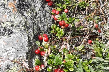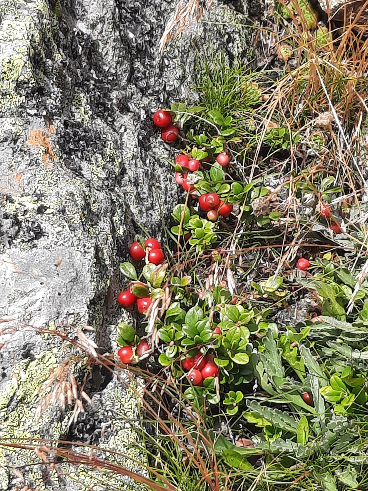 Wir schauen direkt unter uns und erkennen den gut begehbaren schmalen Pfad der roten Variante. Gegenüber im Sonnenlicht das Gargellener Tal, die Straße schlängelt sich hier zwischen sattgrünen Wiesenstreifen und jede Menge Bächen hinauf zum markanten Massiv der Madrisa. Rechts davon eröffnen sich Panoramablicke auf die Sulzfluh, die Drei Türme hingegen, denen man bei der Gauertaler Schneeschuhtour nahekommt, bleiben versteckt. Es ist Zeit für den Abstieg … und die Farben Gelb, Rot und Blau begegnen uns prompt wieder. Diesmal lebendig, als Blutwurz, Alpendistel, Preisel- und Heidelbeeren (wie man Letztere von Rauschbeeren unterscheidet, habe ich schon auf meiner Wanderung aufs Muttjöchle erfahren ;)).
