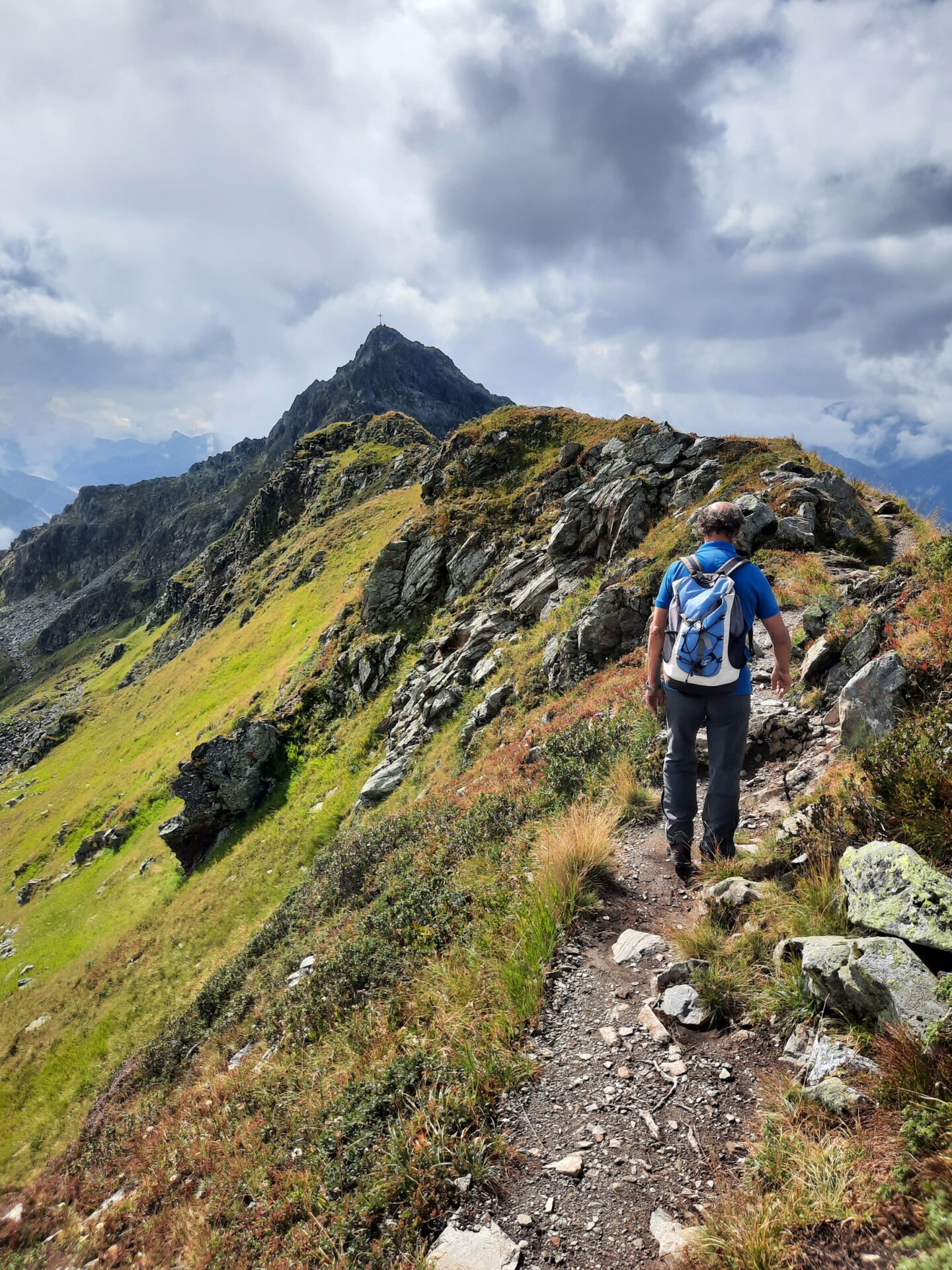 Von der Wormser Hütte könnte man auch absteigen zum Kapell, wo vor allem Kinderherzen am Abenteuerspielplatz Hochjoch laut schlagen werden. Wir aber gehen in leichter Steigung weiter hinauf, auf einem schmalen Pfad zum Kreuzjoch, das wir in rund 15 Minuten erreichen. Weiter geht es auf schmalen Wegen und im mystischen Licht zwischen Erika-Polstern auf den Grat Richtung Zamangspitze. Wir kommen an eine Stelle mit zwei Wegmöglichkeiten.