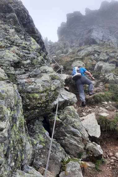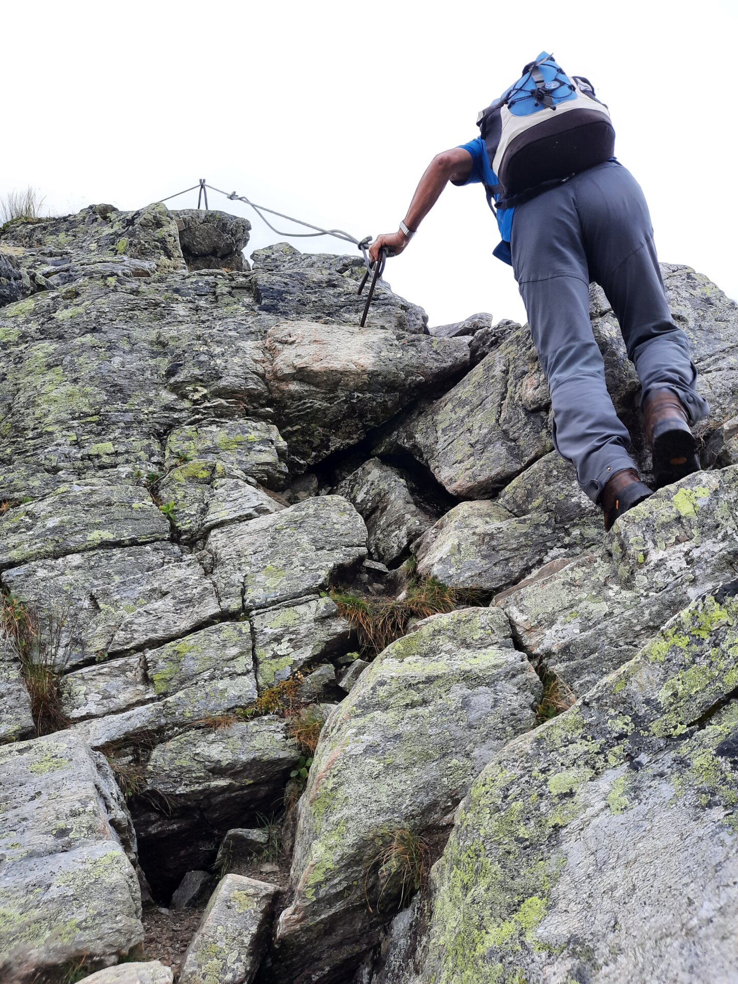 Alfred erklärt, dass gelb-weiße Markierungen auf einfache, meist talnahe Wege hinweisen, rote-weiße Markierungen auf schmälere, steilere Passagen und überwiegend unbefestigte Wege. Die blaue Farbe steht – anders als beim Skifahren – für Wege mit steilen, teilweise ausgesetzten Stellen, evtl. auch mit Kletterpassagen. Auf die Zamangspitze kann man auf rotem sowie blauem Weg gelangen, wir wählen die blaue Variante. Und die macht richtig Spaß! Auch wenn die leichte Kletterei viel zu kurz ist, spannend ist sie allemal. Hier mal Hand an den Fels legen, dort mal eine kurze Seilversicherung – es gibt auch einen ganz kleinen Kamin ;). Klar, wer mehr Kletter-Adrenalin braucht, der kann den Piz Buin begehen, der sich heute partout nicht zum Angucken entblößen will. Die Vallüla hingegen zeigt sich in ihrer vollen pyramidenförmigen Pracht. Und dann erneut Vierbeiner: Unter uns auf den Hängen sehen wir eine ganze Herde Gämse!
