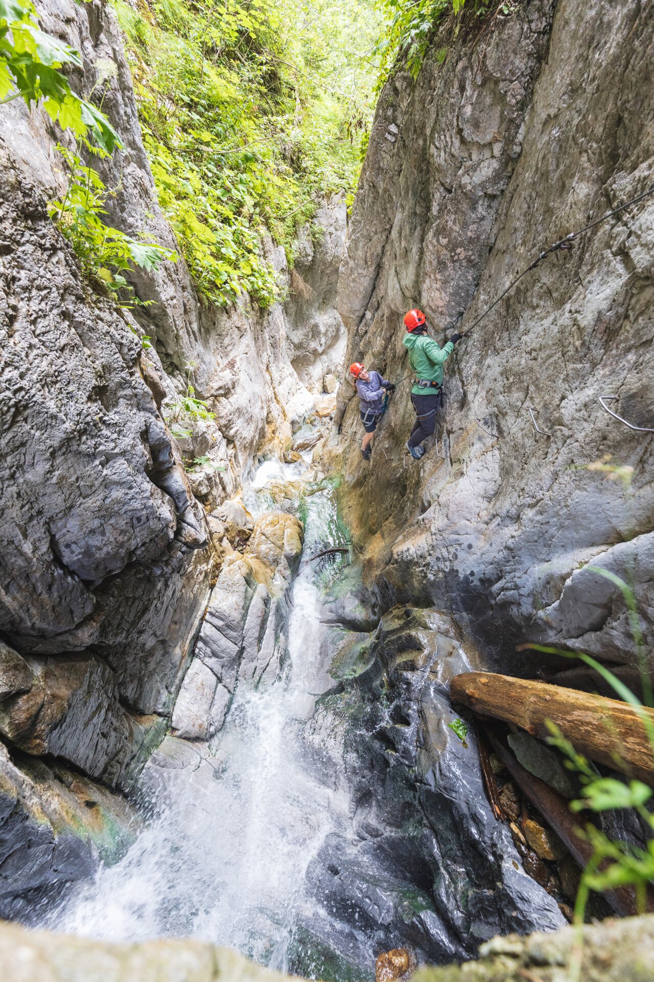 Wer schon Erfahrung hat, ist relativ schnell durch, doch Innehalten lohnt sich ab und an. Beim Abstieg lockt noch der Klettersteig Rongg, ebenfalls kurz, ebenfalls mit Wasserfall und zusätzlich einer Seilbrücke, die zwar problemlos umgangen werden kann, deren Überquerung aber auch nicht allzu viel Mut erfordert. Da gibt es andere Kaliber. Röbi und Rongg sind dennoch immer einen Ausflug wert.