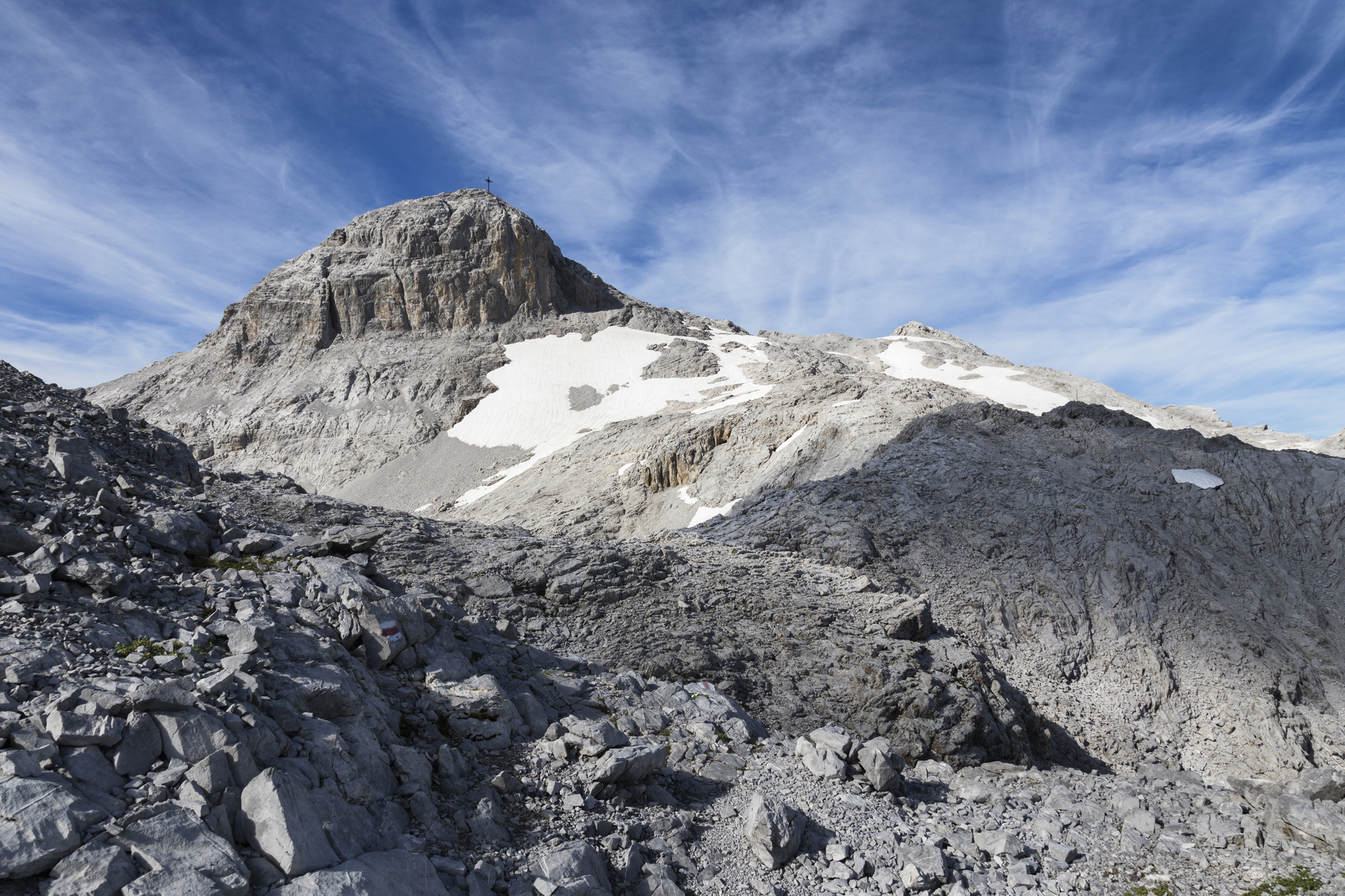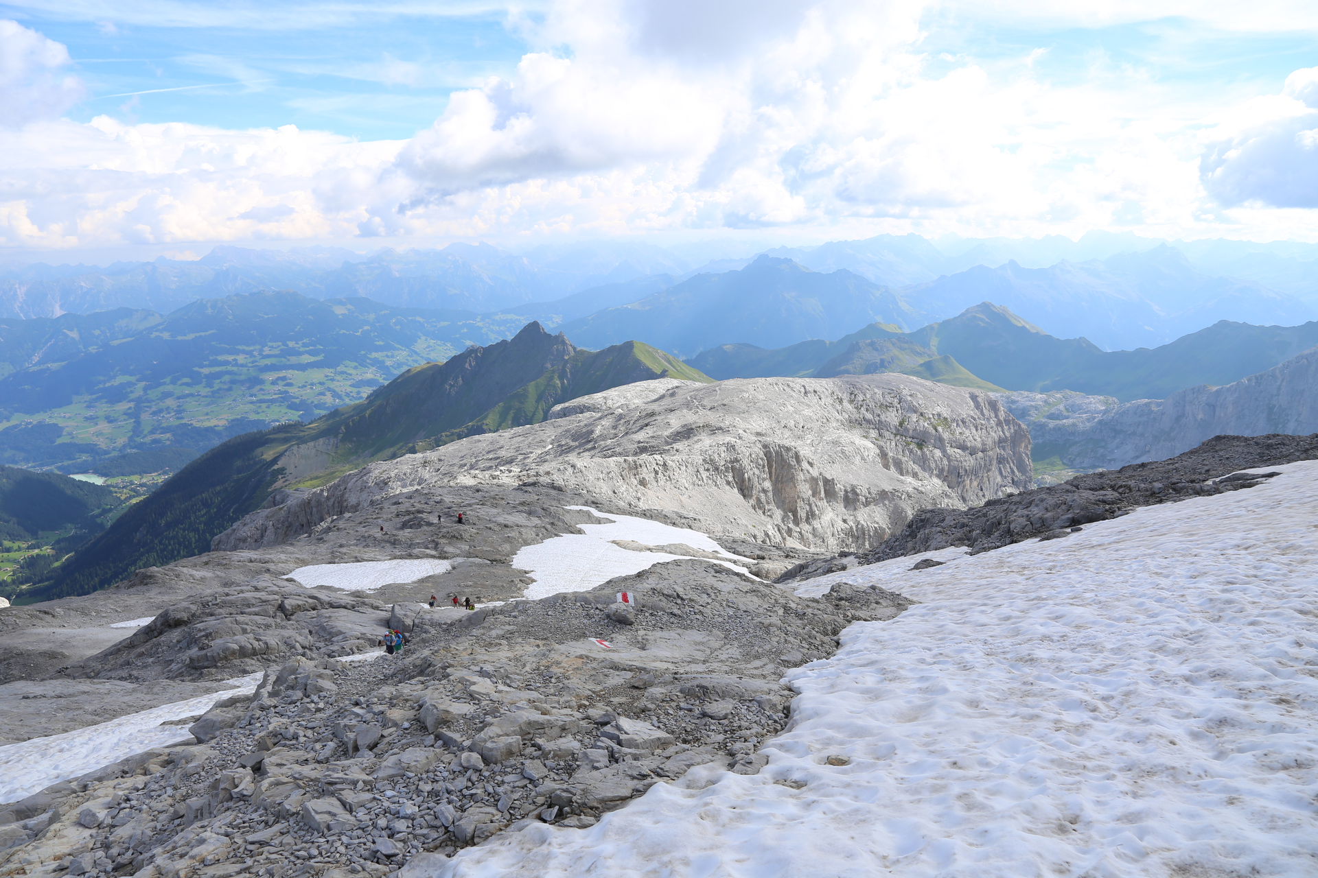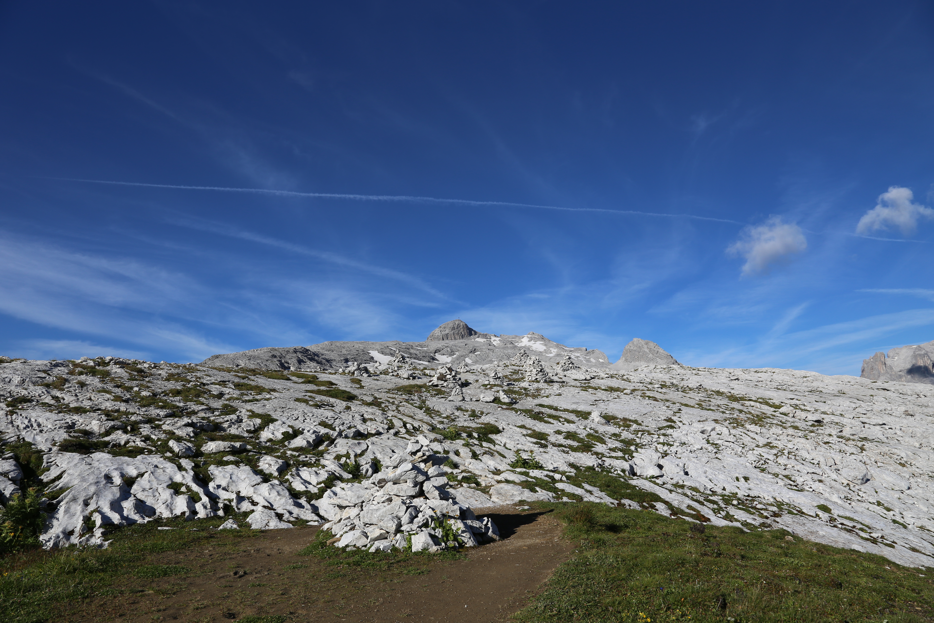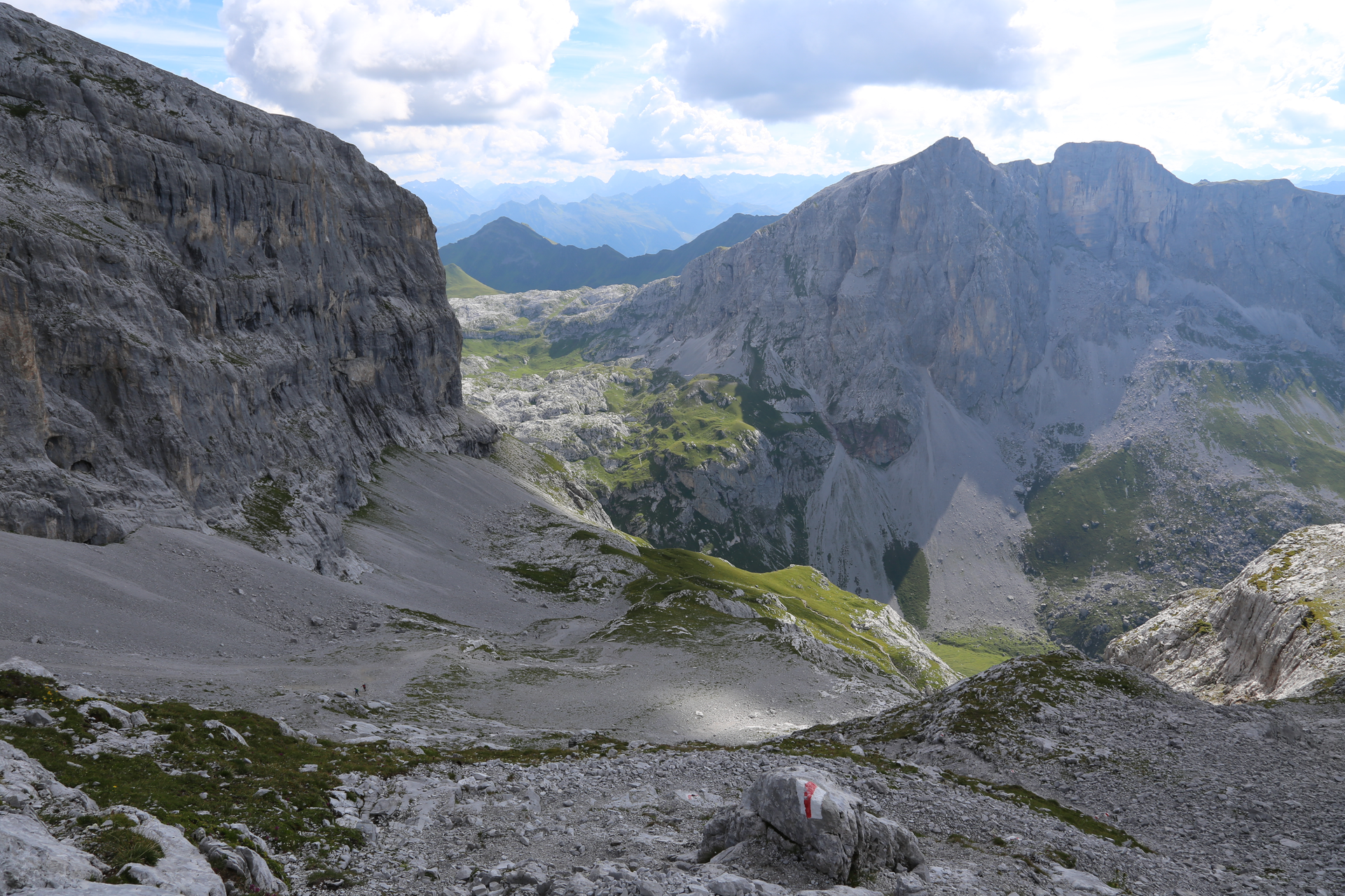 After a short break at the summit, the path leads over the white limestone towards the Tilisuna Hut.