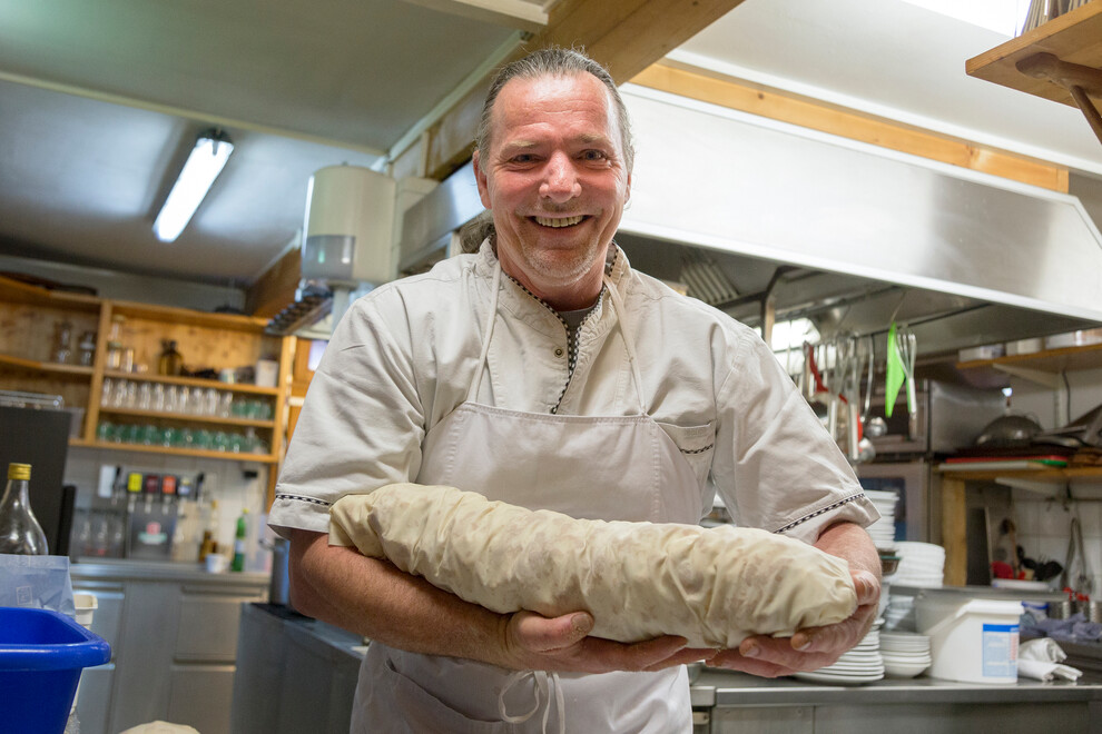 Christian serves a very special creation for dessert: curd cheese lasagne with vanilla sauce and stewed plums. “This is only available here,” Christian proudly announces, as he came up with the recipe himself. Anyone wanting to know exactly how he makes his delicious curd cheese lasagne had better hit the road.