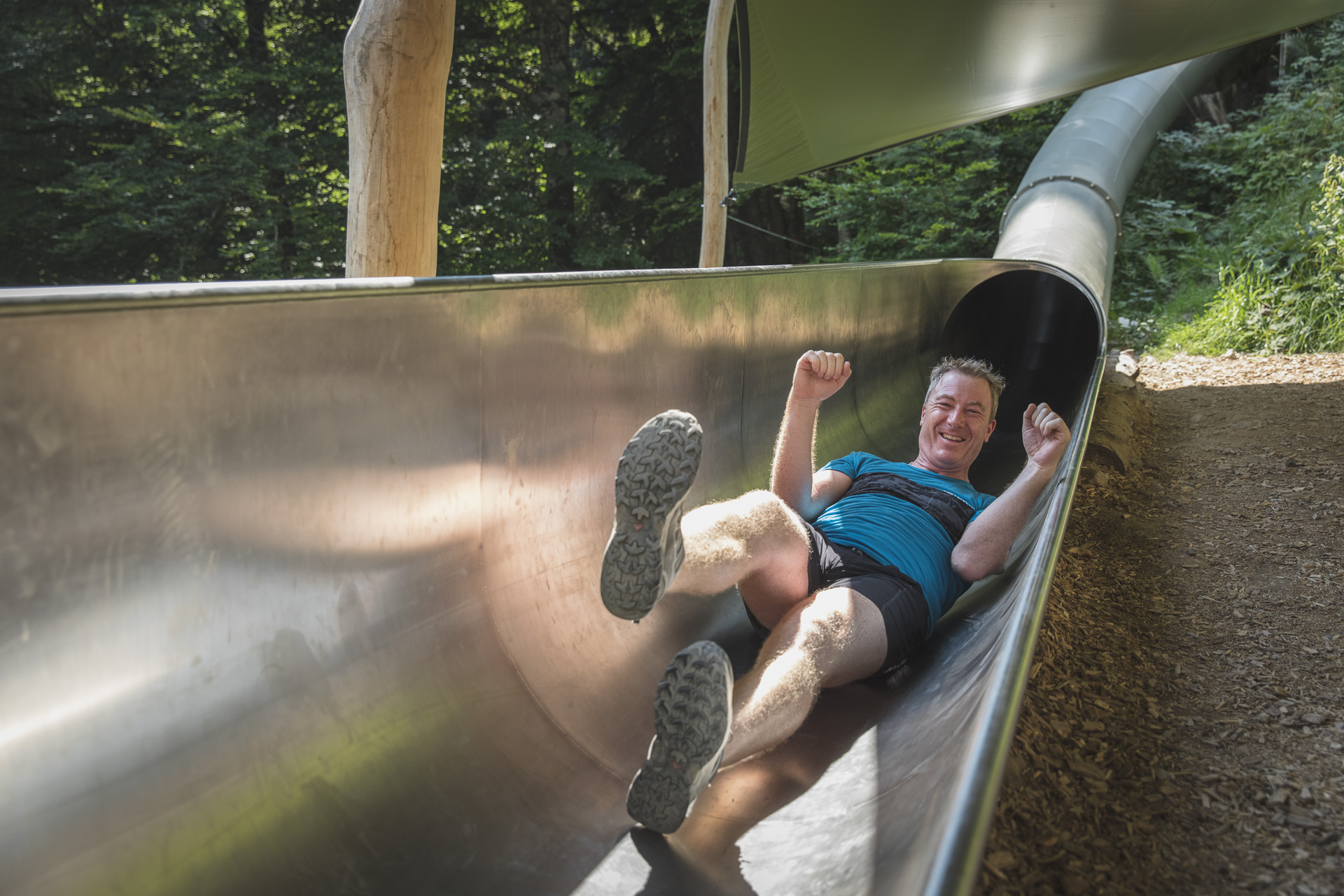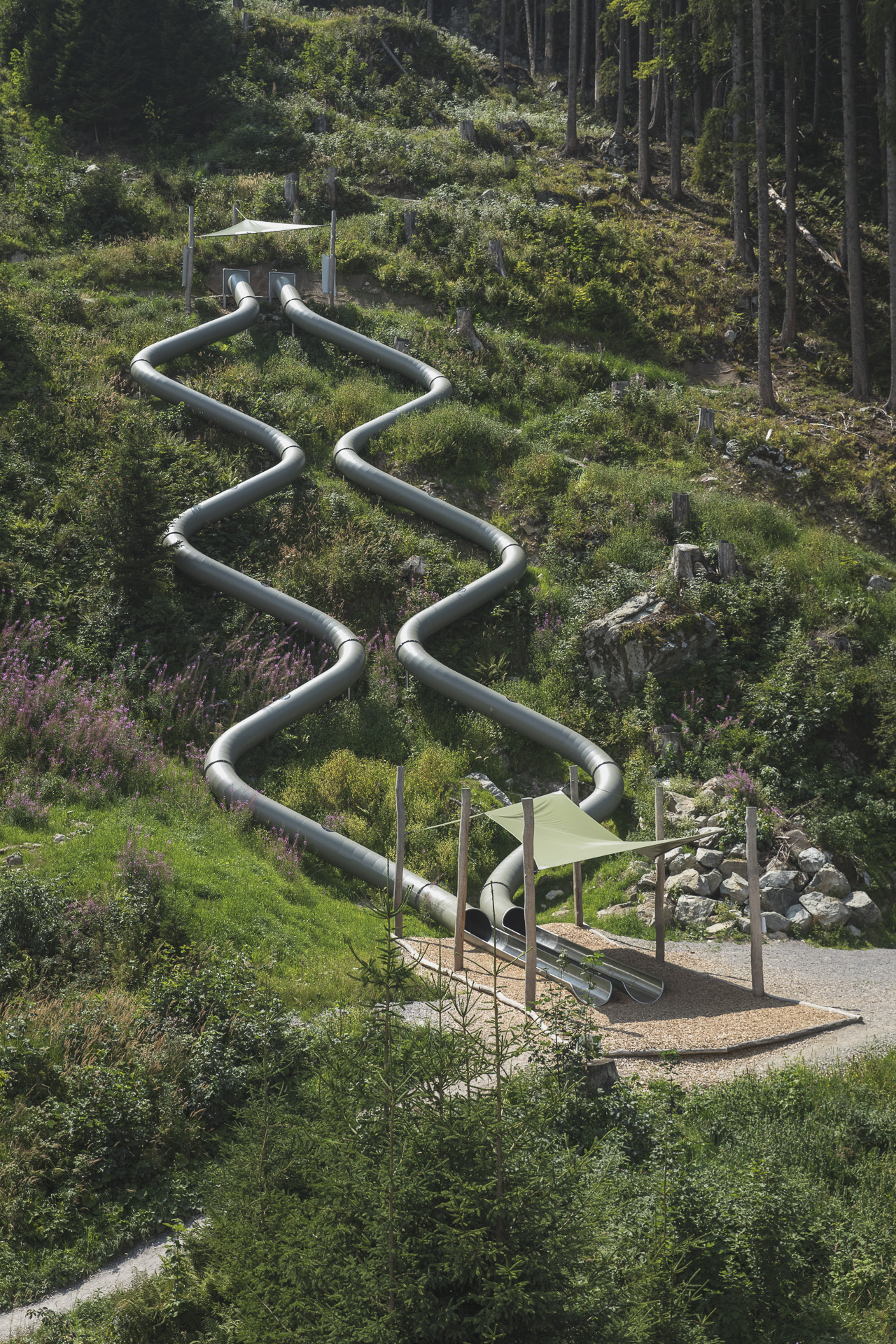 Der etwas anspruchsvolle Wanderweg verläuft unmittelbar unter der Gomerbahn von Matschitz nach Latschau und dient als Zustieg zu den Rutschen des "Waldrutschenpark - Golm".
